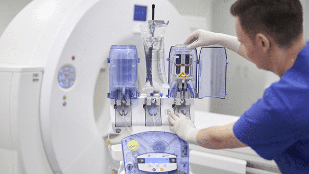Zusätzlich lässt sich mit der Funktion „CDadapt“ die Kontrastmitteldichte (CD) automatisiert und nach Bedarf prozentual anpassen. Dies ermöglicht einen einfacheren Arbeitsablauf (z. B. bei Herzuntersuchungen). Davon profitieren Anwenderinnen und Anwender gleich doppelt, denn der geringere Verbrauch reduziert auch die Kosten. Die Restmengen in den Gebinden sind durch ein Ampel-System leicht erkennbar und können zudem genau abgelesen werden. Für einen hohen Patientendurchsatz kann der CTmotion Spicy ab sofort mit Großgebinden von insgesamt bis zu zwei Litern Kontrastmittel* und bis zu zwei Litern Natriumchlorid (NaCl) aufgerüstet werden.