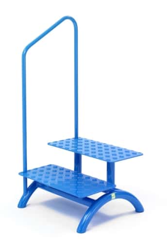 Die Trittstufen sind aus Aluminium-Riffelblech gefertigt und mit einer blauen Pulverbeschichtung versehen. Optional ist ein Handlauf erhältlich.