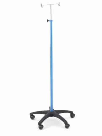 Dieser Infusionsständer steht auf einem Fünf-Stern-Fuss mit 52-mm-Rollen und einem verstellbaren Doppelhaken.