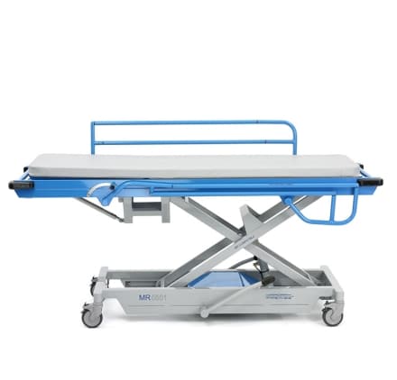 Der höhenverstellbare MR-sichere Rollwagen wurde vollständig bei 7 Tesla getestet. Mit der serienmässigen Trendelenburg-Funktion wurde die Tragfähigkeit deutlich auf 220 kg erhöht.